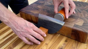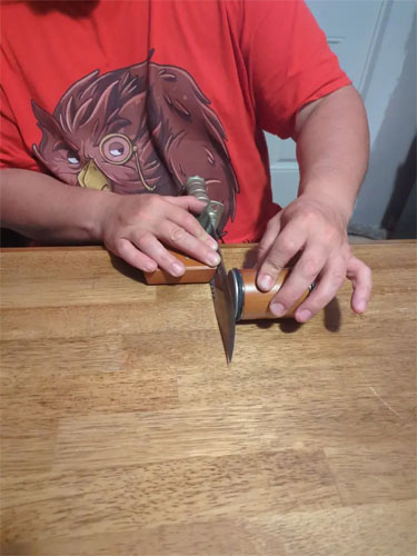 Για υψηλότερα μαχαίρια, όπως ένα μεγάλο κινέζικο μαχαίρι σεφ, τοποθετήστε ένα προστατευτικό ή κάποιο κοπής κάτω από τον ακονιστή δίσκο για να ανυψώσετε την αιχμή στο επίπεδο της κοπής.